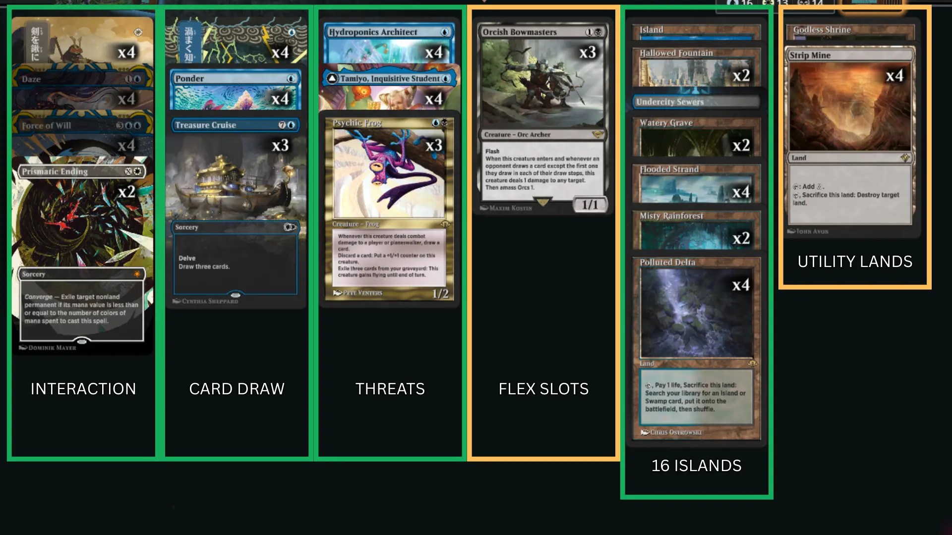 There really is not much wiggle room. Once you cut the Card Draw, you will begin to notice “wrong half” problems, and you’ll also need to readjust the manabase, too. Threats can be replaced, but in my opinion, these are already the best threats you should play in blue. The interaction suite should be replaced with whatever fits best to your personal ladder metagame.